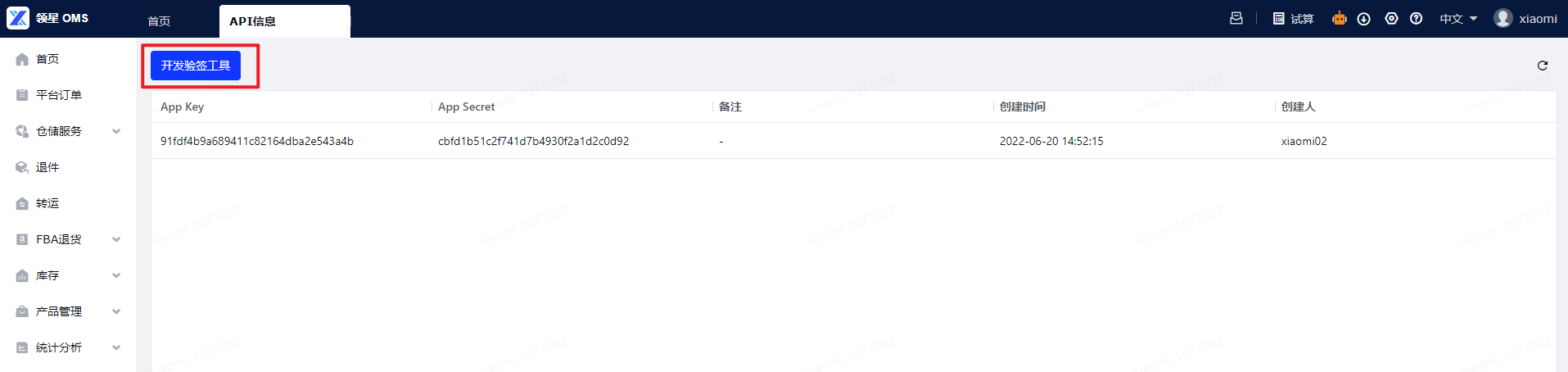 对接前可以在OMS后台的API信息的开发验签工具进行调试